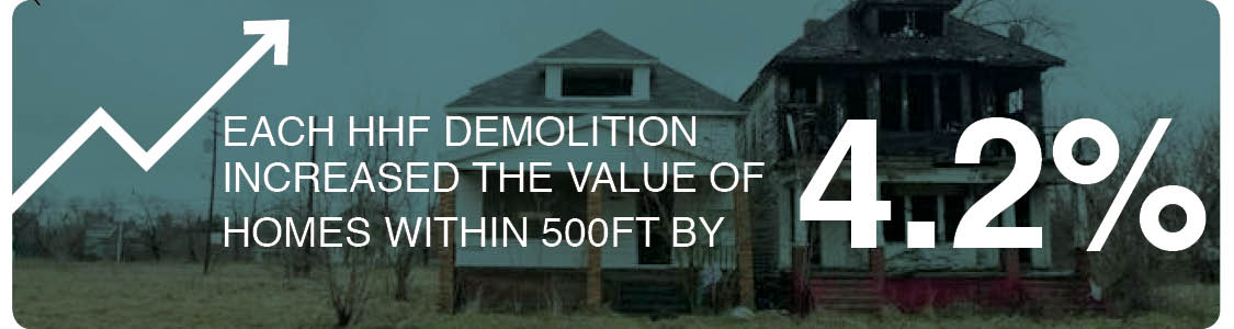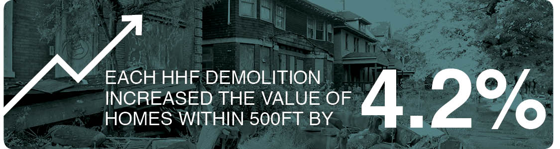 The research suggests that each demolition in the targeted demolition zones increases the value of occupied single family homes within 500 feet by an estimated 4.2%.