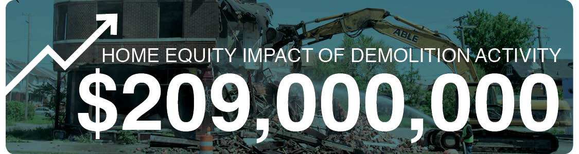 The study found that each demolition in the Detroit Hardest Hit Fund target areas increased surrounding occupied home values by an estimated 4.2%. Cumulatively, the home equity impact of all demolition activity was calculated at $209,000,000. More details can be found in the reports below.