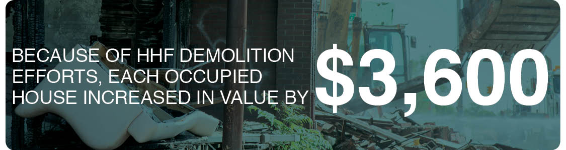 Each occupied house in the Hardest Hit Fund Blight Elimination target zones is now worth more – by about $3,600 – because of the HHF Demolition Program.
